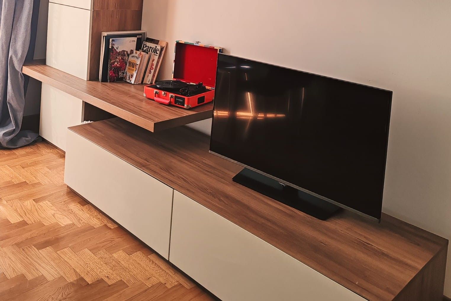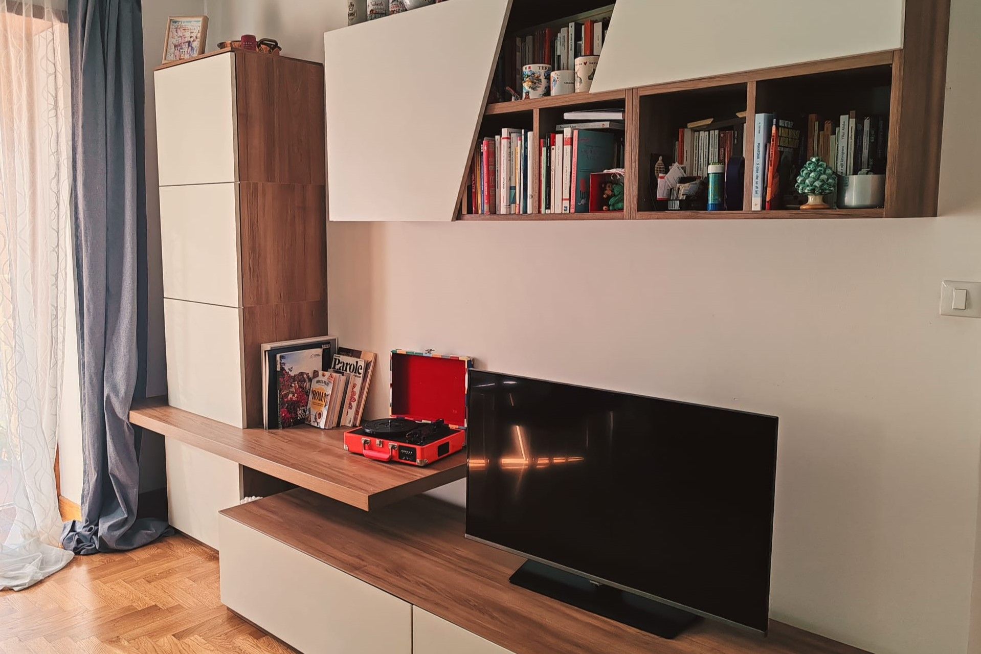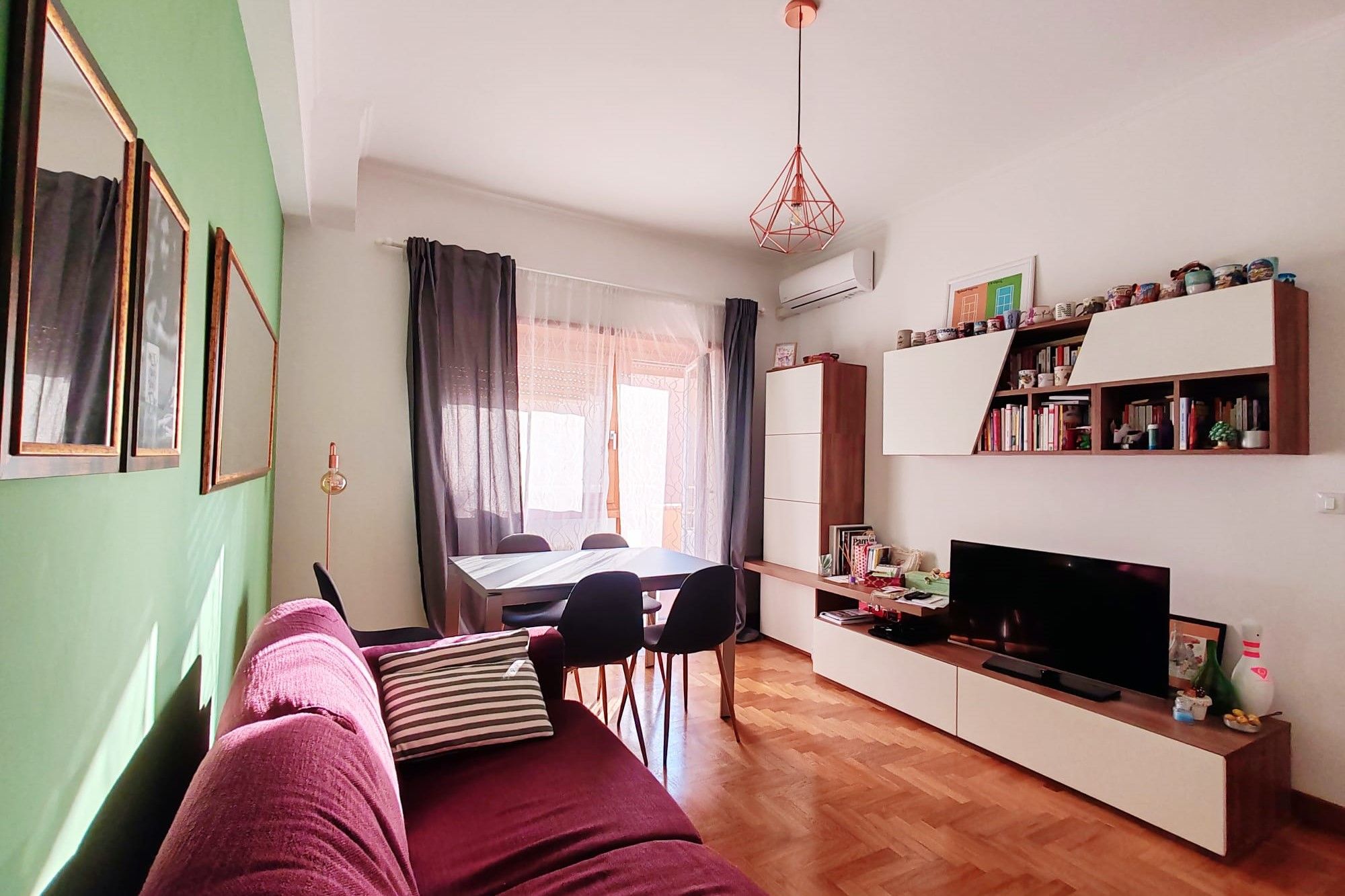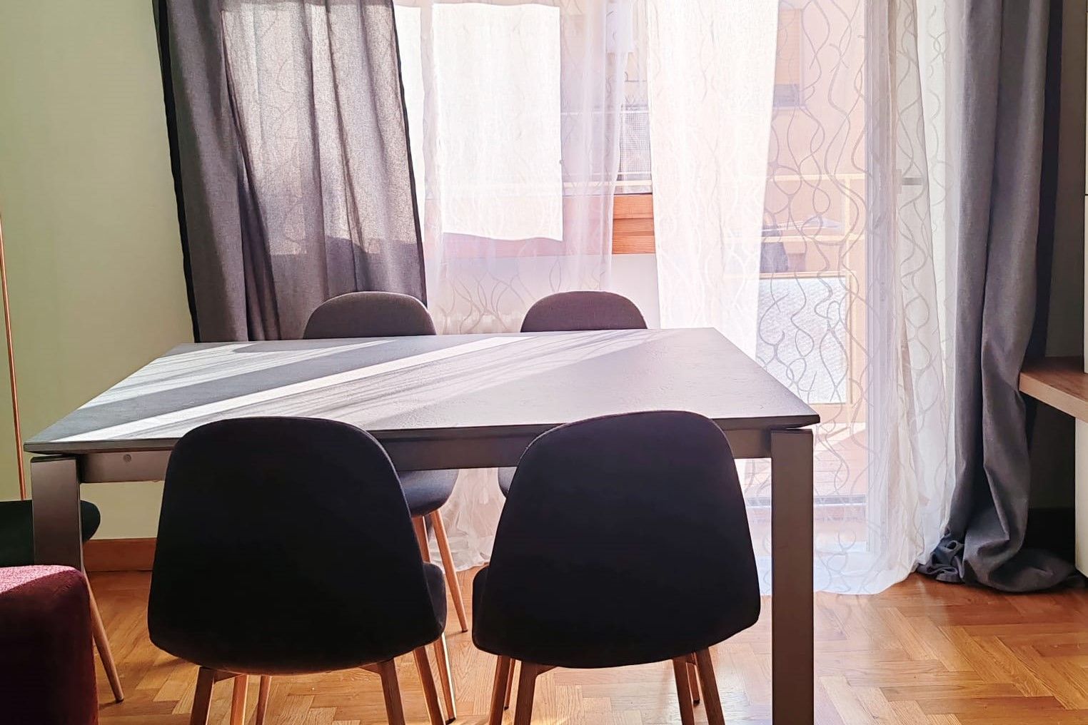 A comfortable living room with a table for up to 8 people, a sofa bed with a 21 cm mattress perfect for satisfying sleep. A smart TV and a library with city guides about Rome. A double window with access to the private balcony.