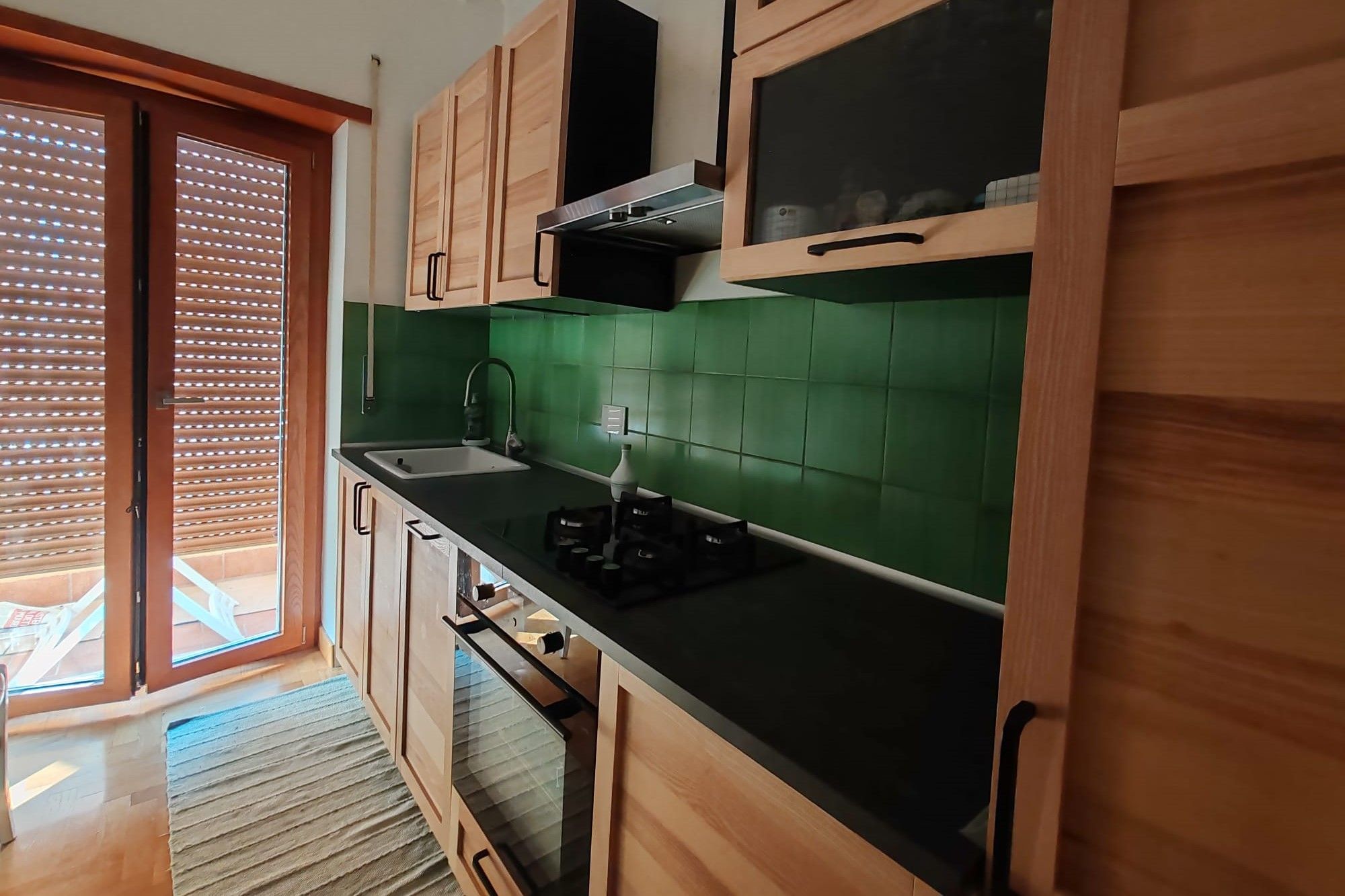 The kitchen of the Domus Cornelia is a mix of wooden furniture and handcrafted tiles. It has four gas burners and an electric oven, refrigerator with freezer and various tools to support those who want to cook. In the wall units you can find plates and glasses for every type of dish and drink.