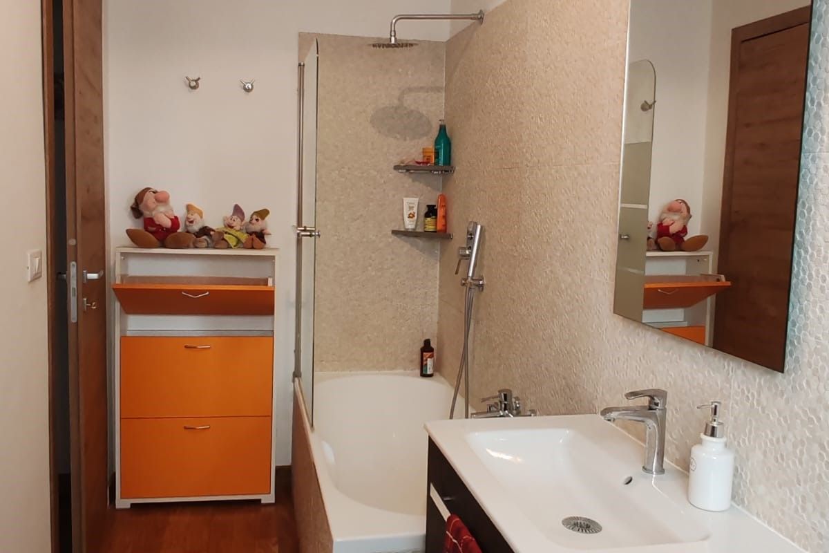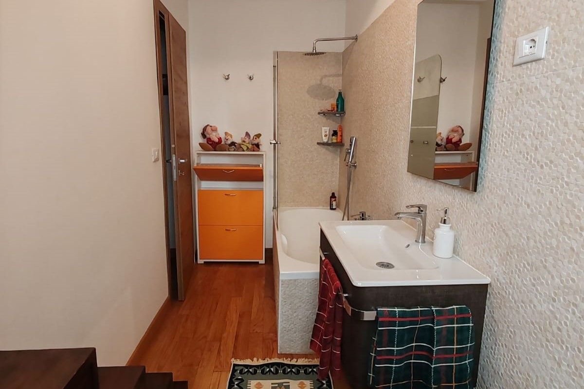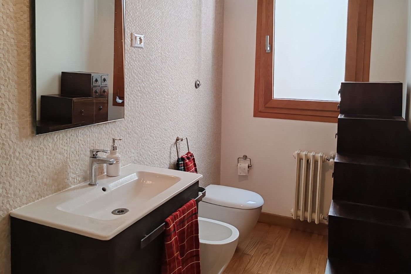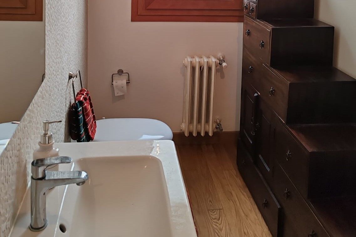 The bathroom of the Domus has a bathtub with shower. Inside, a nice shelving with numerous drawers for storing towels and beauty products. At guests' disposal, behind the door, a shoe rack. The hairdryer is a must.